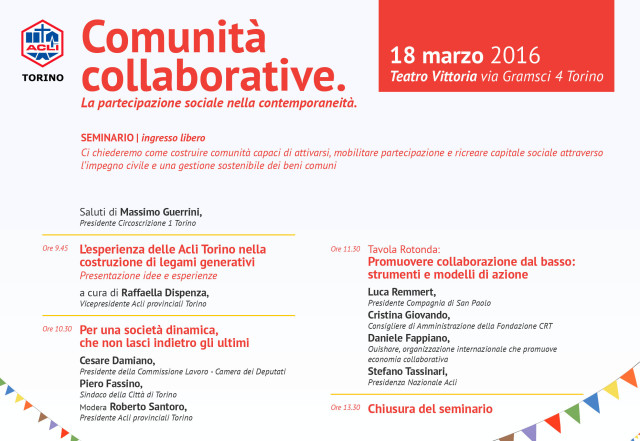 Interessante appuntamento oggi, venerdì 18 marzo, al Teatro Vittoria di via Gramsci 4: si è svolto il seminario organizzato dall’ACLI, Associazione cristiana dei lavoratori italiani, dal titolo “Comunità collaborative, la partecipazione sociale nella contemporaneità”. Sono uscite