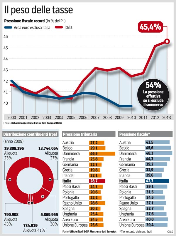 Qualche giorno fa la Corte dei Conti ha usato parole forti definendo quella fiscale «una pressione già fuori linea nel confronto europeo». L’obiettivo del risanamento dei conti resta prioritario ma tasse, tributi, acconti, versamenti che arrivano al 45% del reddito rappresentano una soglia che ormai ha raggiunto il livello di guardia. Se non lo ha già superato.